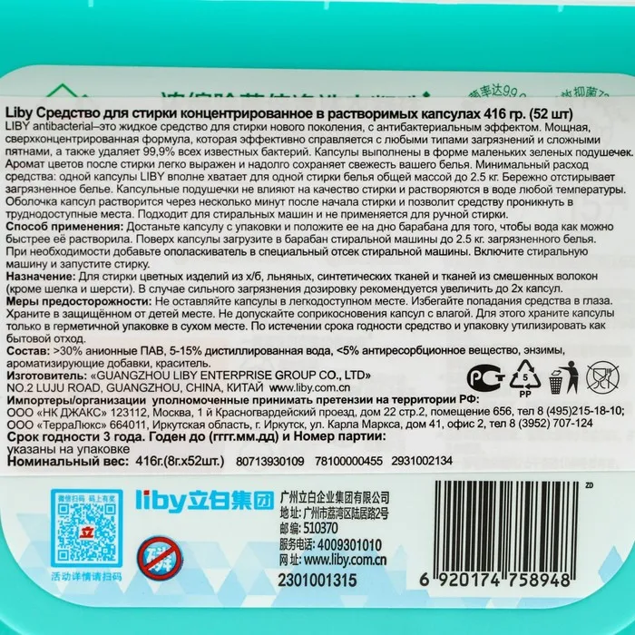 Капсулы для стирки белья – это жидкое средство для стирки белья нового поколения, с антибактериальным эффектом. Подходит для стиральных машин и не применяется для ручной стирки. Мощная, сверхконцентрированная формула, которая эффективно справляется с любыми типами загрязнений и сложными пятнами, а также удаляет 99,9% всех известных бактерий. Капсулы выполнены в форме маленьких зеленых подушечек. Аромат цветов после стирки легко выражен и надолго сохраняет свежесть вашего белья. Минимальный расход средства: одной капсулы LIBY вполне хватает для одной стирки белья общей массой до 3 кг. Бережно отстирывает загрязненное белье. Капсульные антибактериальные подушечки не влияют на качество стирки и растворяются в воде любой температуры. Оболочка капсул растворится через 2-3 минуты после начала стирки и позволит средству проникнуть в труднодоступные места. Подтвержденный эко состав геля для стирки внутри капсул, не наносит вреда окружающей среде. Может применяться на даче, не нанося вреда септикам