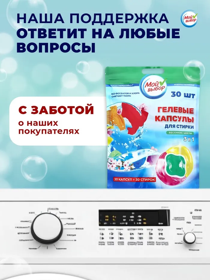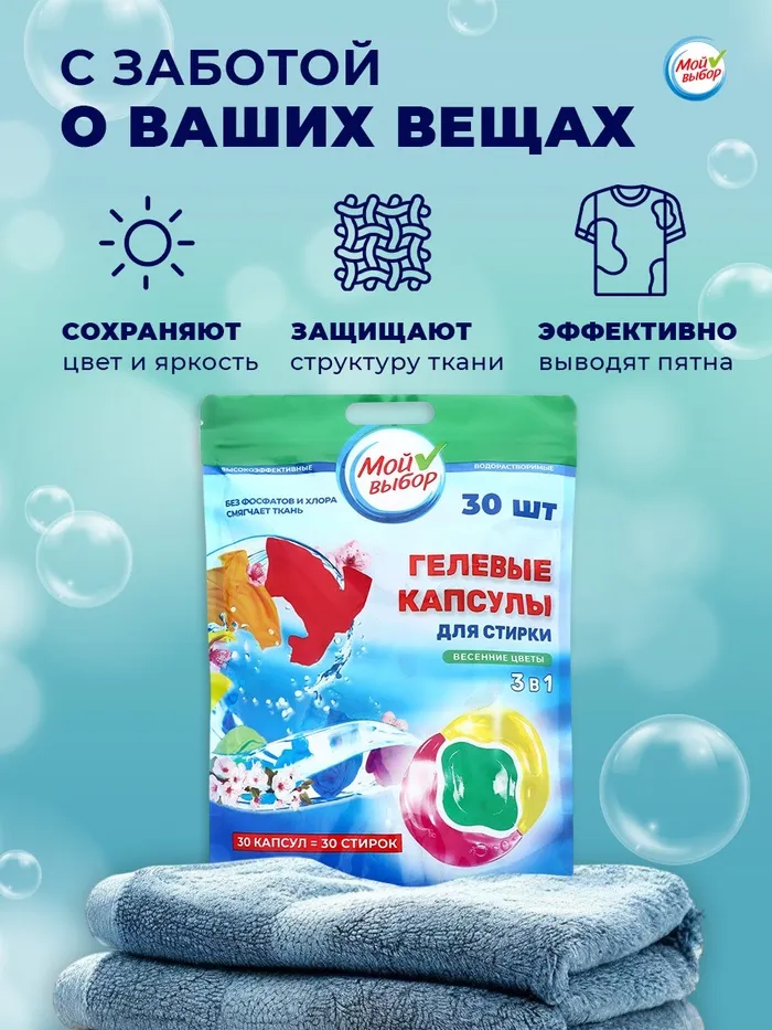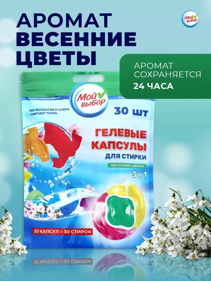 Ощутите всю прелесть весеннего цветения с капсулами для стирки "Весенние цветы" от Мой Выбор 3в1. Эти универсальные капсулы сочетают в себе три важные функции: эффективное удаление пятен, смягчение тканей и защита цвета. Теперь ваша одежда будет не только идеально чистой, но и мягкой на ощупь, сохраняя свою яркость и насыщенность.