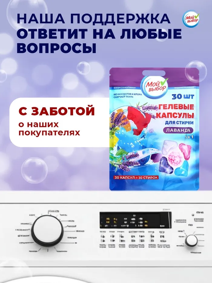 Капсулы для стирки «Мой Выбор» 5в1 «Лаванда» — это уникальное средство, которое обеспечивает профессиональный уход за вашими вещами дома. В упаковке содержится 30 капсул по 10 грамм каждая, что позволяет провести 30 стирок.