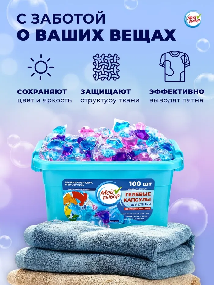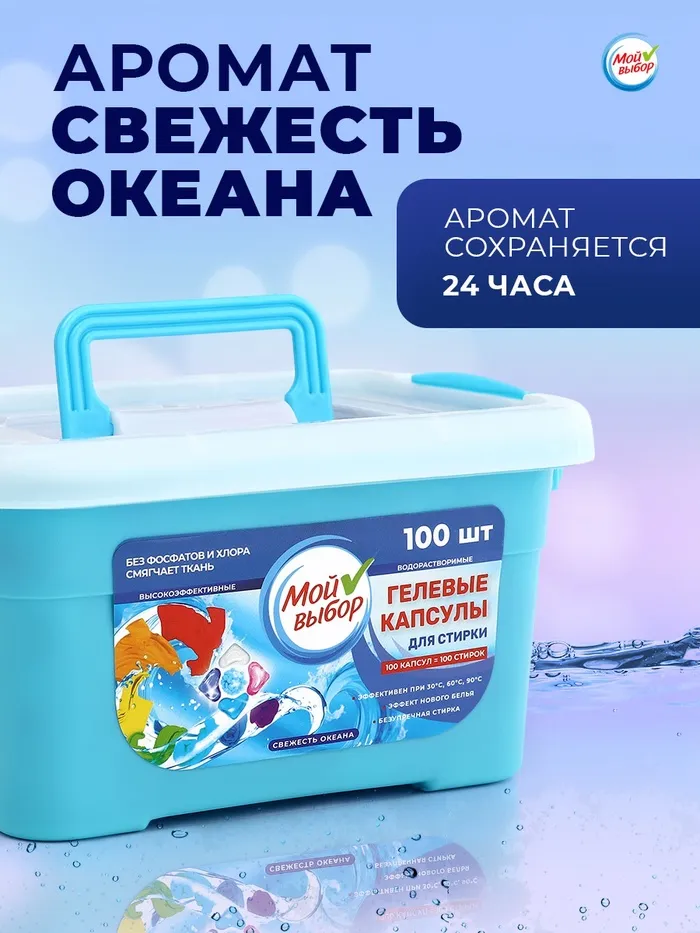 Используйте капсулы для стирки «Мой Выбор» 5в1 «Свежесть океана», чтобы ваши вещи всегда были чистыми, свежими и приятно пахли.