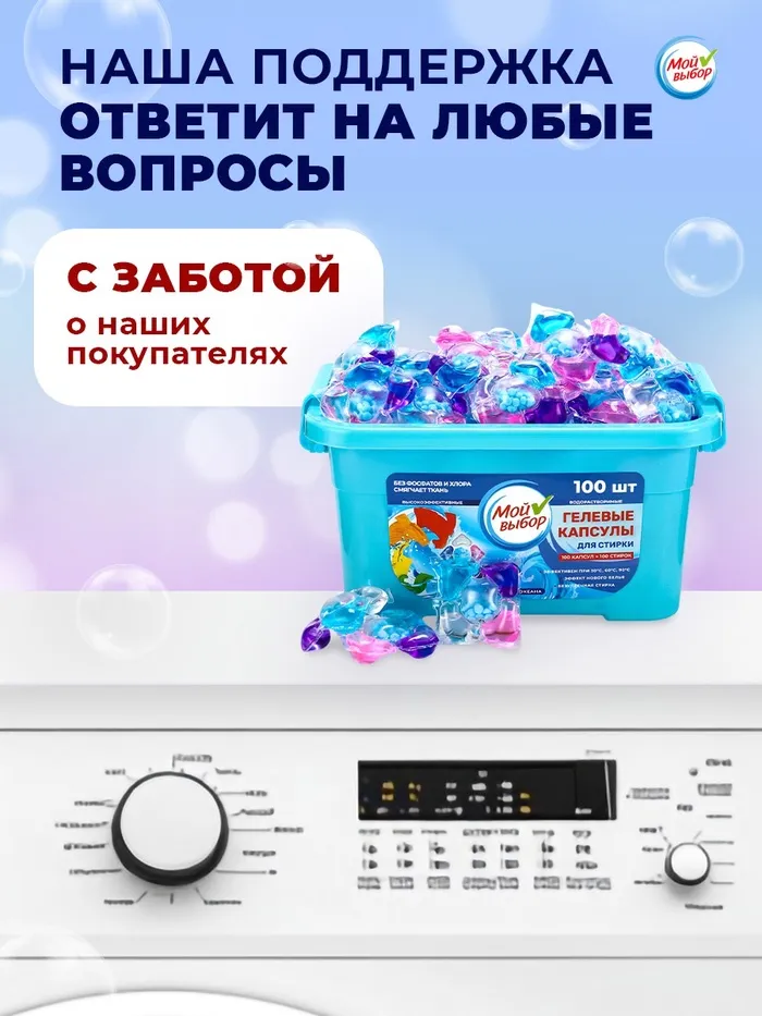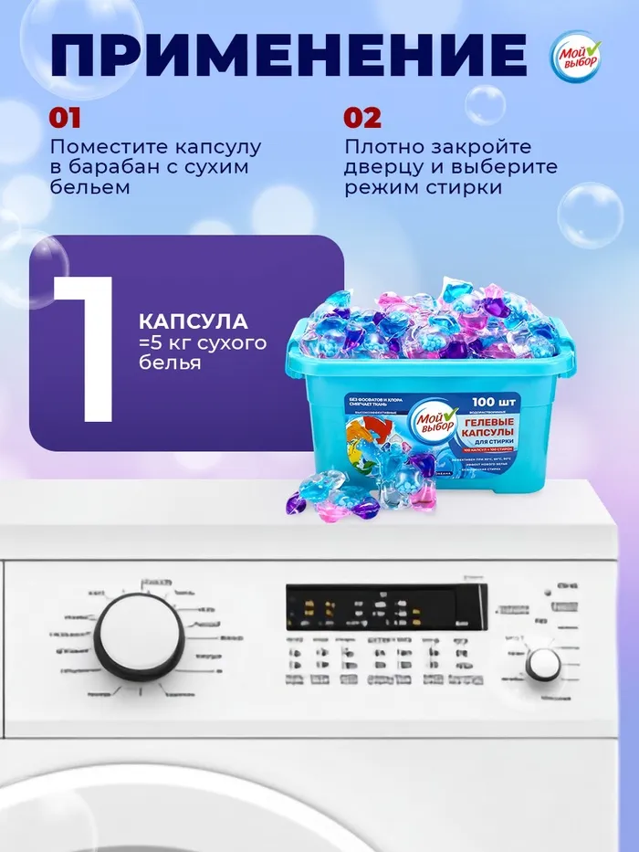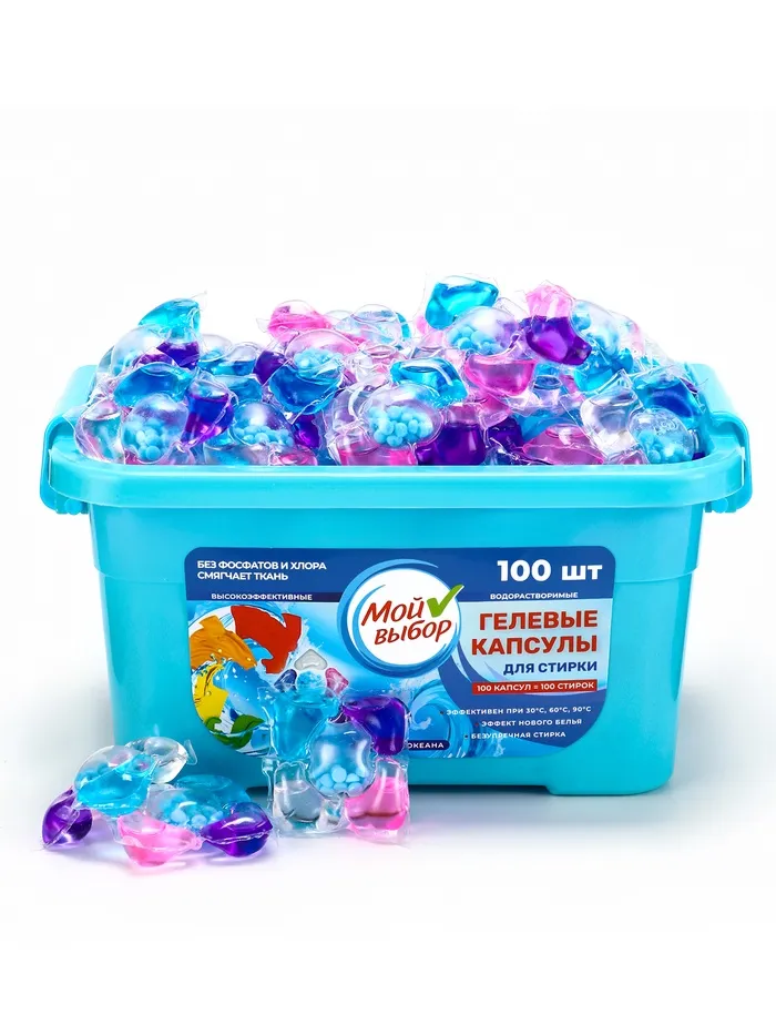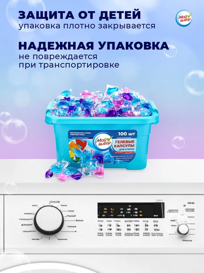 Капсулы для стирки «Мой Выбор» — это инновационное средство, которое обеспечивает профессиональный уход за вашими вещами дома. В упаковке содержится 100 капсул по 10 грамм каждая, что позволяет провести 100 стирок.