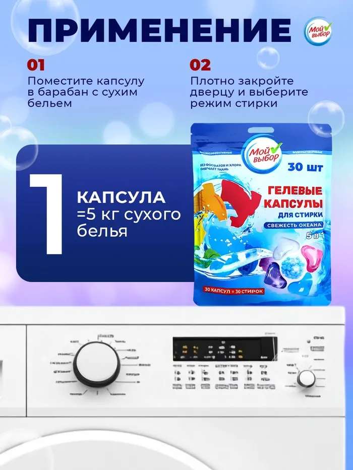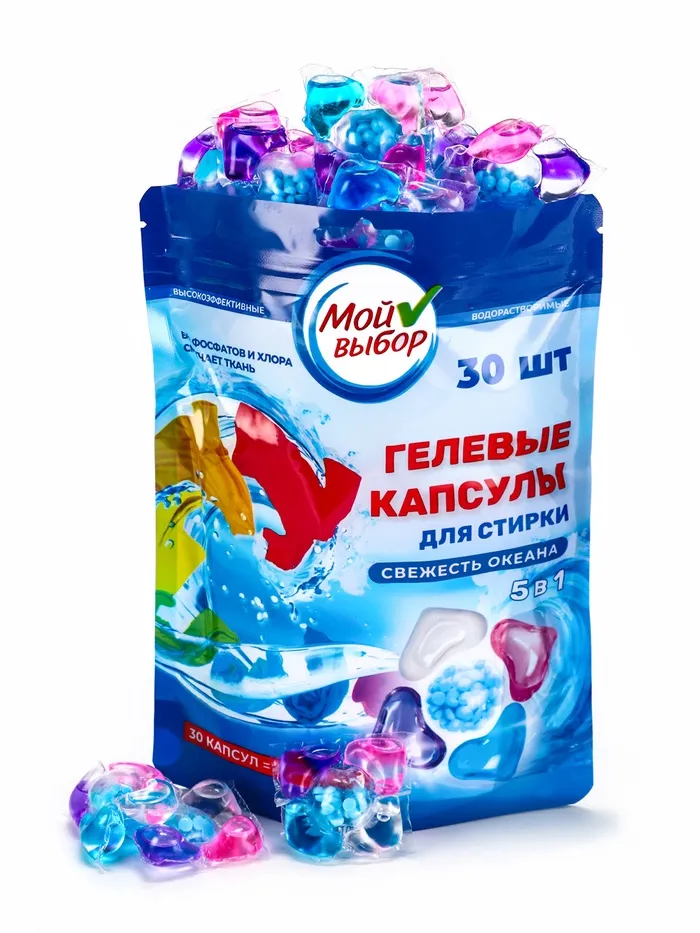 Ощутите свежесть морского бриза с капсулами для стирки "Свежесть океана" от Мой Выбор 5в1. Эти универсальные капсулы сочетают в себе пять важных функций, обеспечивающих идеальную чистоту и уход за вашими вещами: