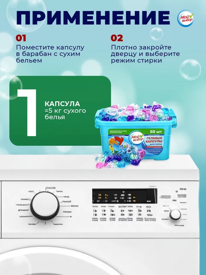 Для одной стирки достаточно использовать одну капсулу, которая помещается непосредственно в барабан стиральной машины перед загрузкой белья. Соблюдайте рекомендации для стирки, указанные на бирке одежды, и капсулы «Мой Выбор» подарят вашим вещам свежесть и чистоту, а вам — удовольствие от процесса стирки.