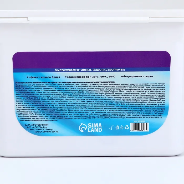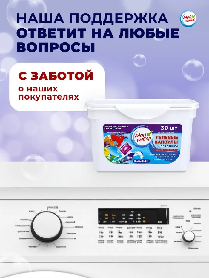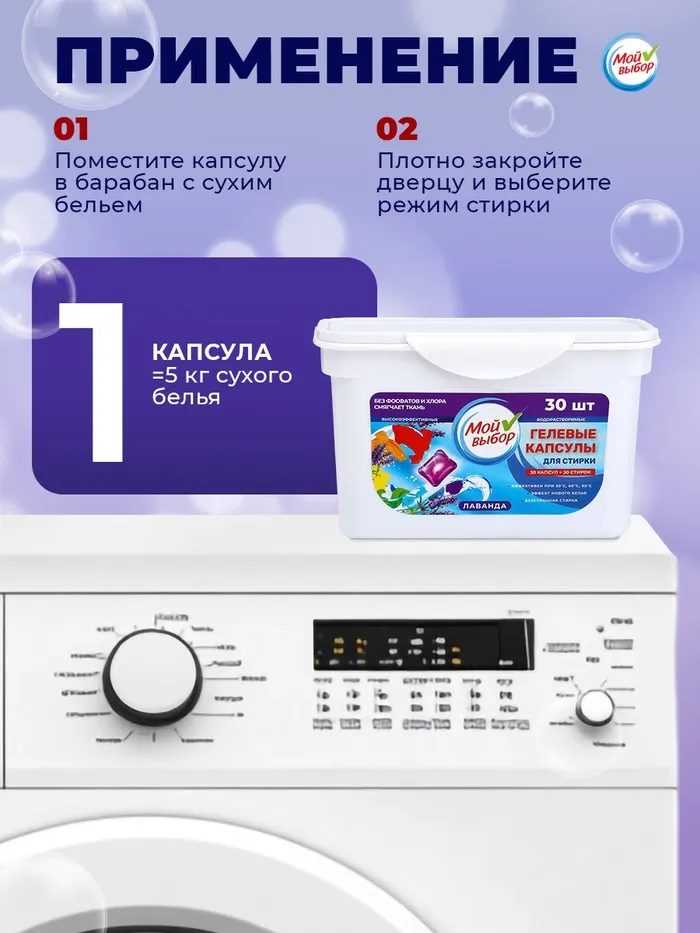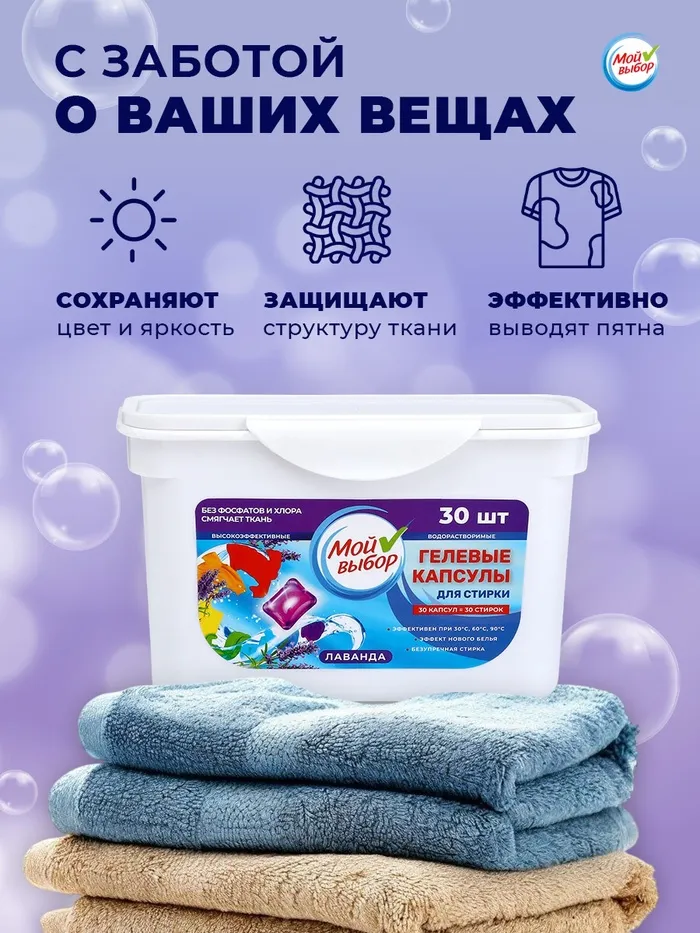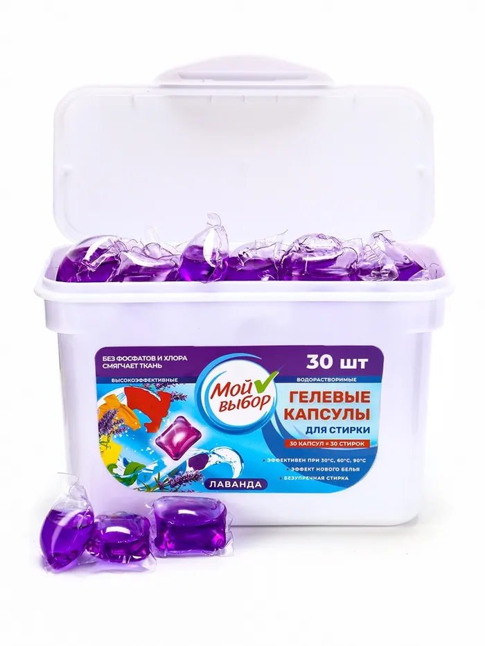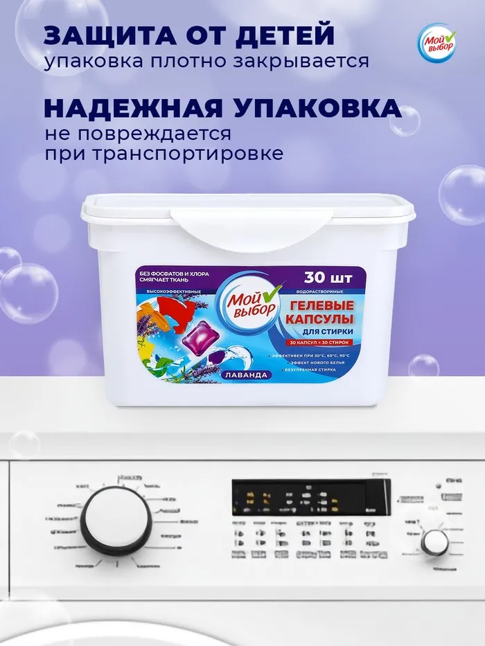 Капсулы для стирки «Мой Выбор» 5в1 «Лаванда» — это уникальное средство, которое обеспечивает профессиональный уход за вашими вещами дома. В упаковке содержится 30 капсул по 8 грамм каждая, что позволяет провести 30 стирок.