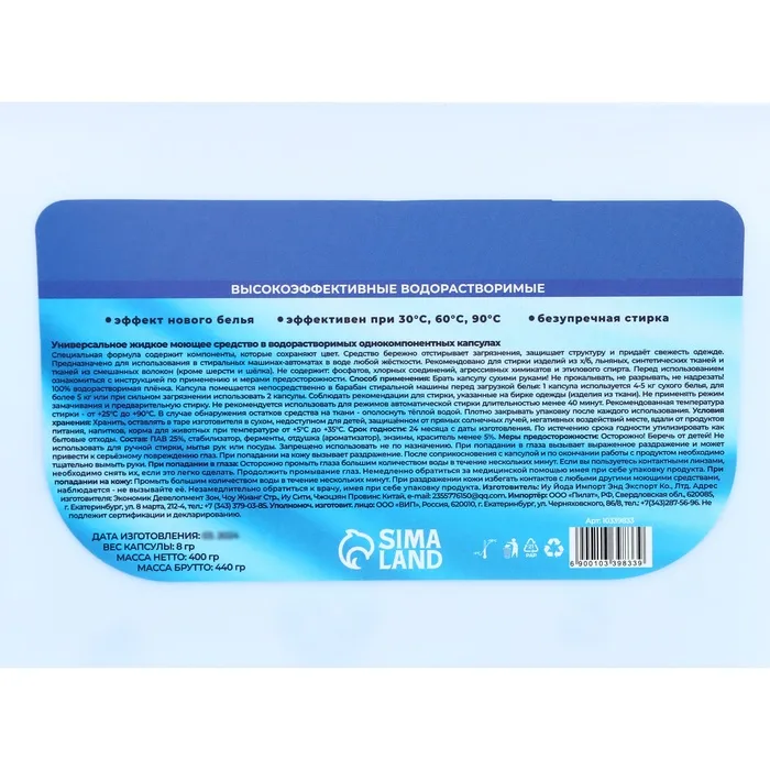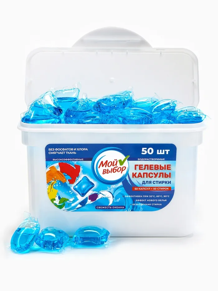Упаковка на 50 капсул обеспечит вас достаточным запасом моющего средства на длительное время, позволяя наслаждаться качественной стиркой и приятным запахом океана на протяжении нескольких недель.