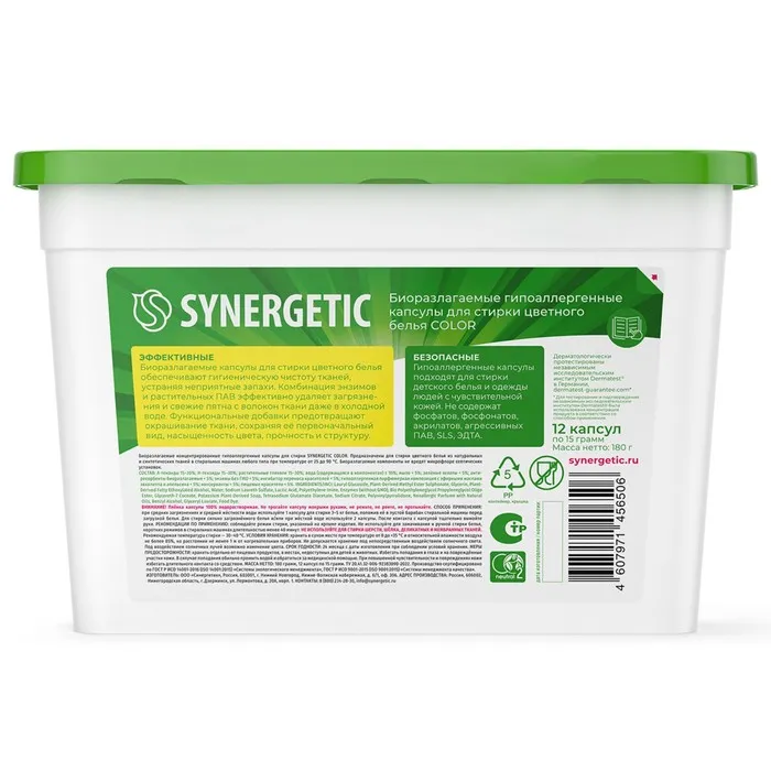 Капсулы для стирки Synergetic гипоаллергенные Color,биоразлагаемые,концентрированные,12 шт — Характеристики