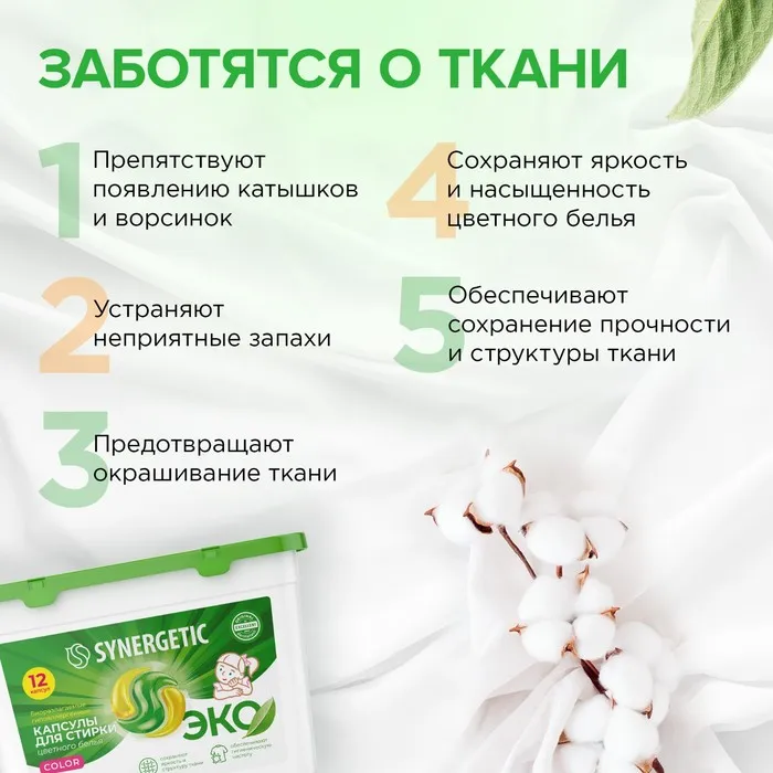 Биоразлагаемые гипоаллергенные капсулы для стирки SYNERGETIC COLOR обеспечивают гигиеническую чистоту, проникая глубоко в волокна ткани и расщепляя самые сложные загрязнения, препятствуют появлению катышков и ворсинок, а также устраняют неприятные запахи. Комбинация энзимов и растительных ПАВ эффективно удаляет загрязнения и свежие пятна с волокон ткани даже в холодной воде.