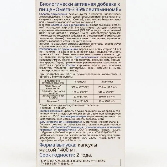 Биологически активная добавка Омега-3 35% с витамином Е содержит стандартизованное количество эйкозапентаеновой (EPA 180 мг) и докозагексаеновой кислот (DHA 120 мг) в 1 капсуле. В производстве используется высококачественный исландский жир LYSI. Несколько этапов очистки сырья гарантирует отсутствие пестицидов и холестерина. Продукт обладает нейтральным запахом и не имеет привкуса.