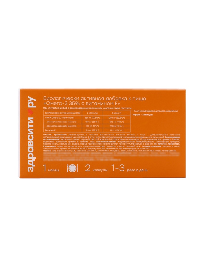 Биологически активная добавка к пище «ОМЕГА-3 35 % с витамином Е» является дополнительным источником полиненасыщенных жирных кислот (ПНЖК) Омега-3, в том числе эйкозапентаеновой и докозагексаеновой кислот, и витамина Е. Содержание биологически активных веществ в составе продукта нормализовано.
