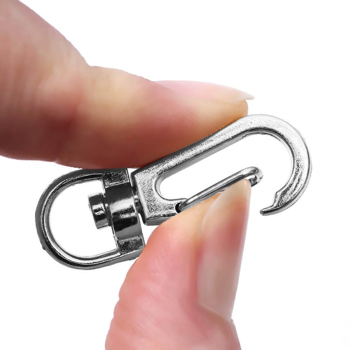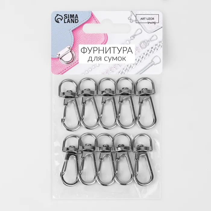 Металлический карабин предназначен для крепления ремней, ручек или декоративных элементов к сумке. Изготовлен из прочного металла, имеет гладкую поверхность и элегантный вид, что делает его не только функциональным, но и стильным элементом фурнитуры.