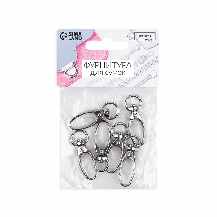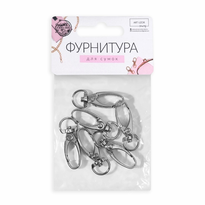 Металлический карабин предназначен для крепления ремней, ручек или декоративных элементов к сумке. Изготовлен из прочного металла, имеет гладкую поверхность и элегантный вид, что делает его не только функциональным, но и стильным элементом фурнитуры.