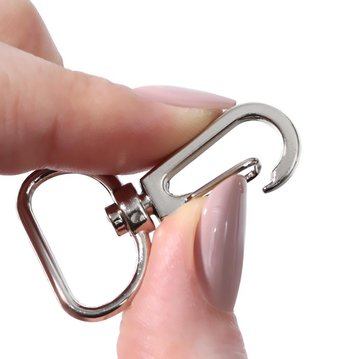 Металлический карабин предназначен для крепления ремней, ручек или декоративных элементов к сумке. Изготовлен из прочного металла, имеет гладкую поверхность и элегантный вид, что делает его не только функциональным, но и стильным элементом фурнитуры.