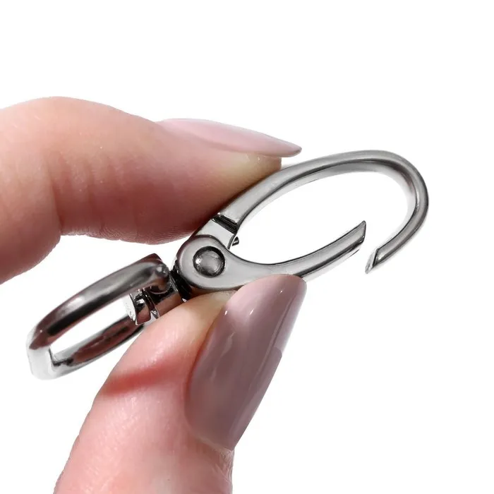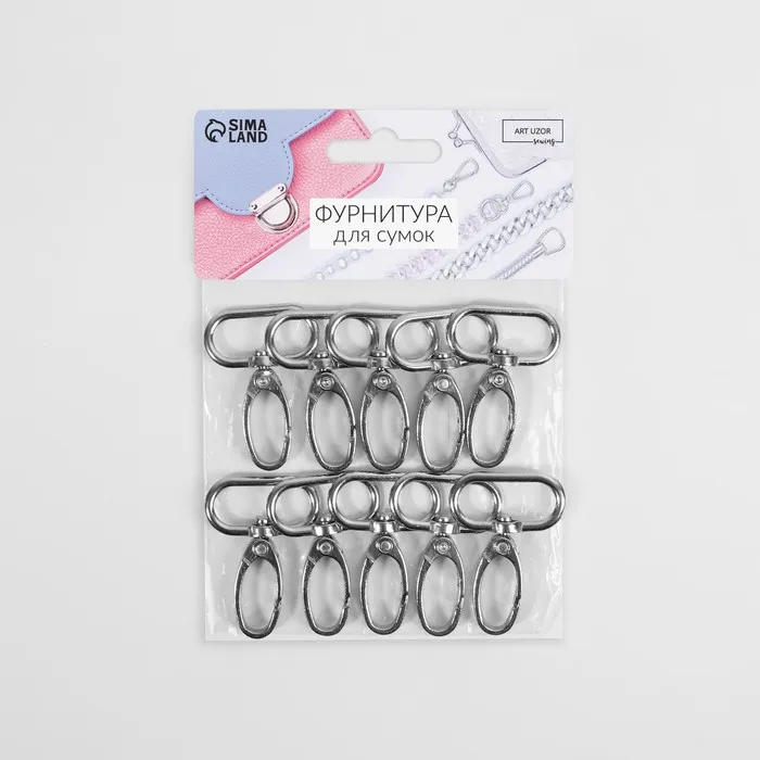 Металлический карабин предназначен для крепления ремней, ручек или декоративных элементов к сумке. Изготовлен из прочного металла, имеет гладкую поверхность и элегантный вид, что делает его не только функциональным, но и стильным элементом фурнитуры.