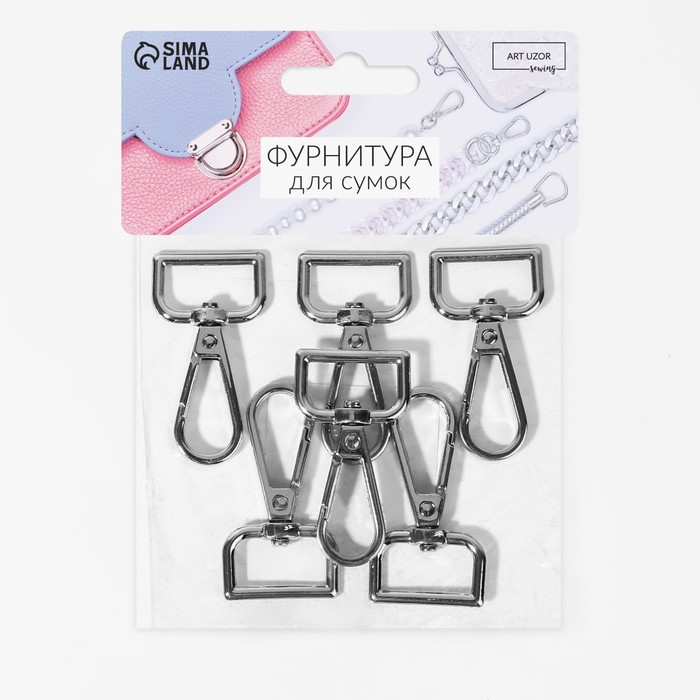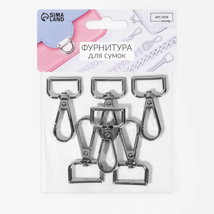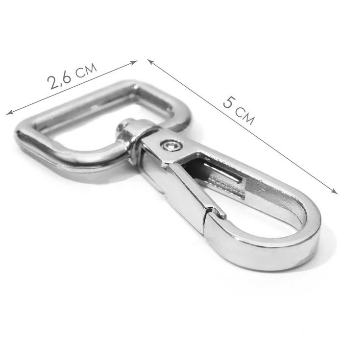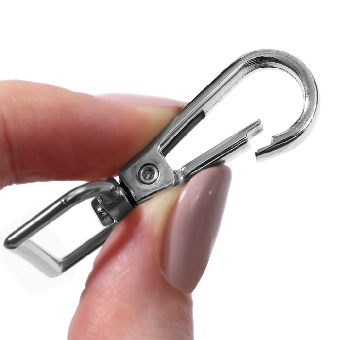 Металлический карабин предназначен для крепления ремней, ручек или декоративных элементов к сумке. Изготовлен из прочного металла, имеет гладкую поверхность и элегантный вид, что делает его не только функциональным, но и стильным элементом фурнитуры. Карабин оснащён пружинным механизмом, который позволяет легко открывать и закрывать его одной рукой, обеспечивая надёжное крепление.