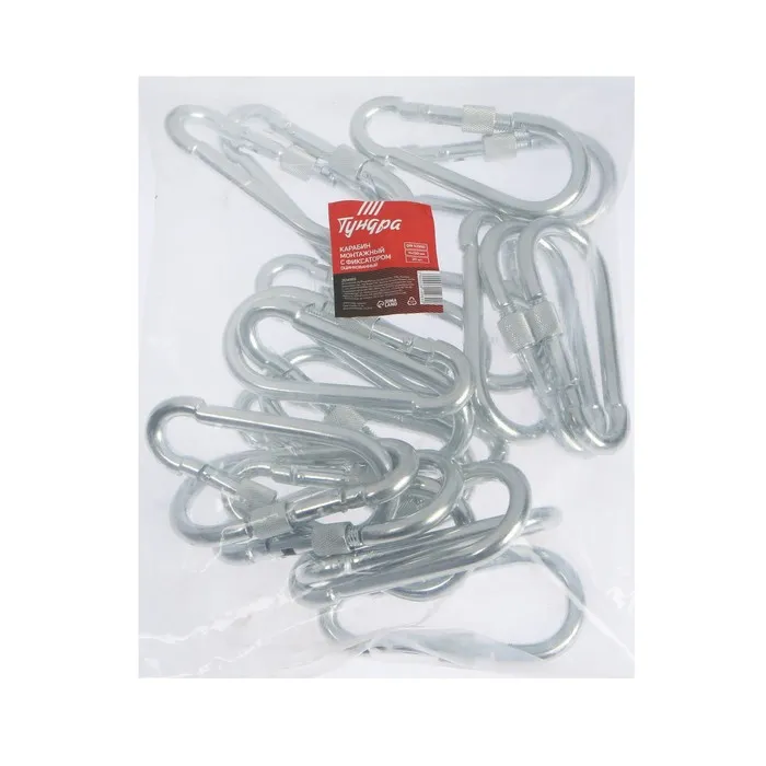 Карабин монтажный с фиксатором ТУНДРА krep применяется для быстрого, простого, надежного, разъемного соединения между собой цепей, тросов, веревок, ремней и т.п., а также для крепления их к различным конструкциям и основаниям.