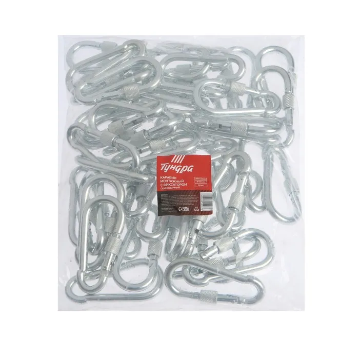 Карабин монтажный с фиксатором ТУНДРА krep применяется для быстрого, простого, надежного, разъемного соединения между собой цепей, тросов, веревок, ремней и т.п., а также для крепления их к различным конструкциям и основаниям.