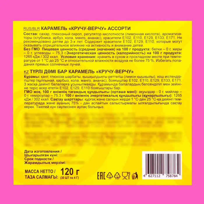 «Кручу-верчу» идеально подходит для перекуса в любое время дня, а также станет отличным угощением на праздниках, вечеринках или семейных посиделках. Благодаря своим ярким цветам и игривой форме, карамель привлекает внимание и вызывает улыбки у взрослых и детей. Откройте для себя мир сладкого удовольствия с карамелью «Кручу-верчу» и поделитесь радостью с близкими!