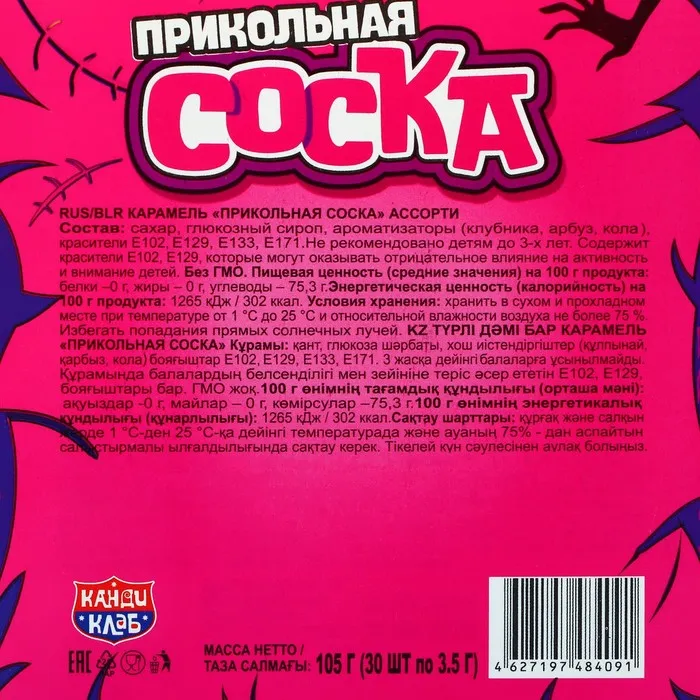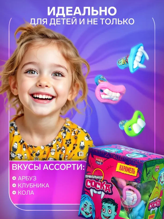 Карамель "Прикольная соска" — это сладость, которая оживит атмосферу и создаст веселое настроение. Наслаждайтесь игривым вкусом и делитесь радостью с окружающими, добавляя эту забавную карамель в свой сладкий репертуар!