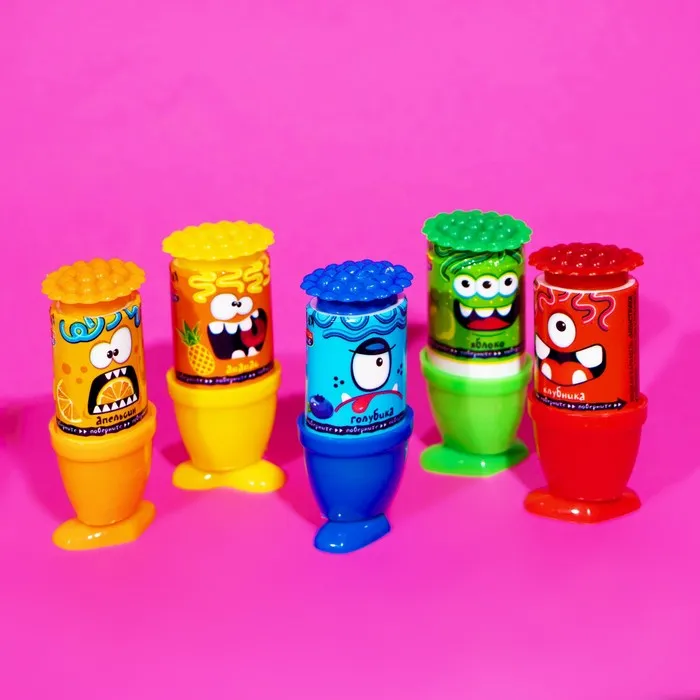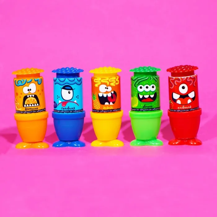 Сладость, которая привлекает одной своей упаковкой в виде кудрявых монстриков. Внутри каждого — жидкая карамель со вкусом клубники, голубики, ананаса, апельсина или яблока!