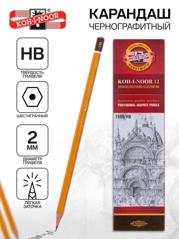 Профессиональный карандаш Koh-I-Noor серии 1500 - наиболее известная модель фабрики. Изготавливается компанией более 120 лет. Модель легко узнаваема благодаря неизменному жёлтому покрытию и позолоченной надписи. Грифель карандаша мягкий и прочный. Оставляет яркий и насыщенный след. Корпус изготовлен из прочной древесины. Это делает карандаш очень удобным при работе с чертежами, графикой и художественными рисунками.