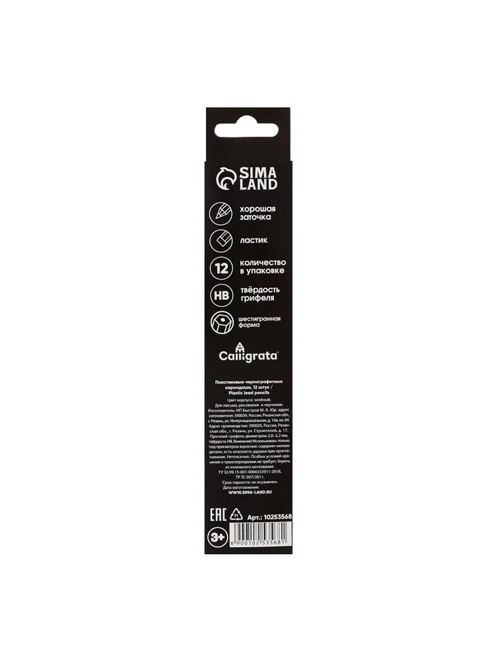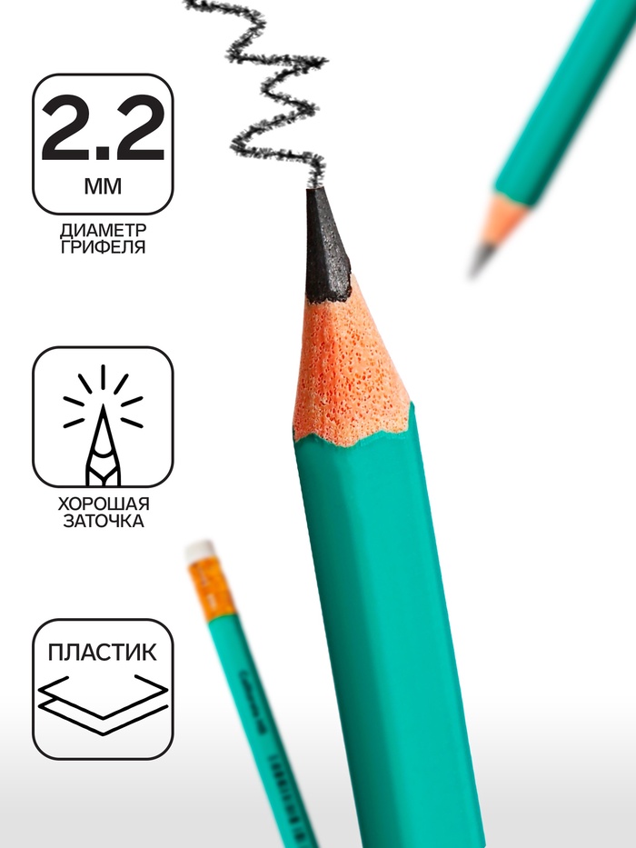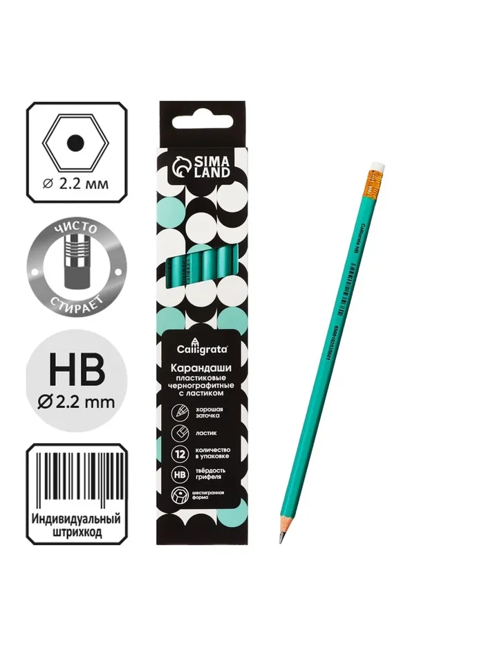 Материал корпуса пластикФорма корпуса шестиграннаяНаличие ластика даЗаточено даДлина 189Цвет корпуса зеленыйДиаметр грифеля 2 ммУдаропрочный грифель нетУпаковка ед. товара отсутствуетНаличие европодвеса даНаличие штрихкода на ед. товара естьДиаметр корпуса 7Вид минимальной групповой упаковки картонная коробка по 12 штукЭКОНОМ сегмент: да