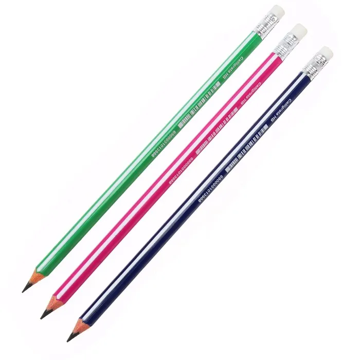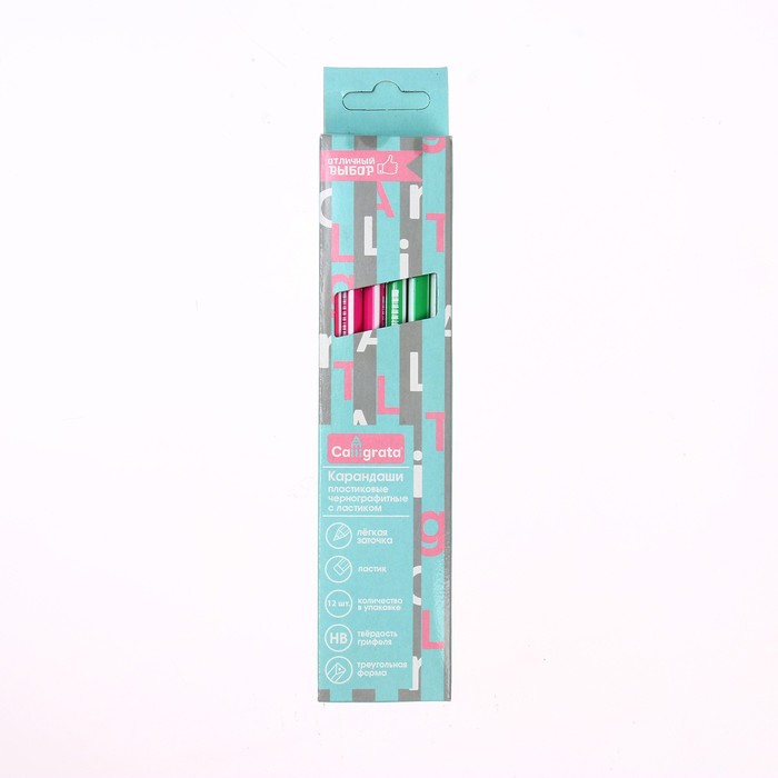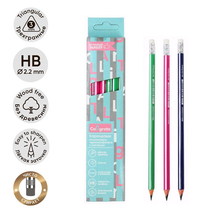 Набор чернографитных карандашей Calligrata - универсального назначения (школа/дом/офис) эконом уровня. Изготовлены из высококачественного пластика, оснащены ластиком. Имеют трехгранное сечение. Карандаши длиной 189 мм легко точатся и не крошатся. Обладают средней степенью твердости – HB. Полосатый эргономичный корпус выполнен в трех цветах (зеленый, синий, красный). Поставляются заточенными.