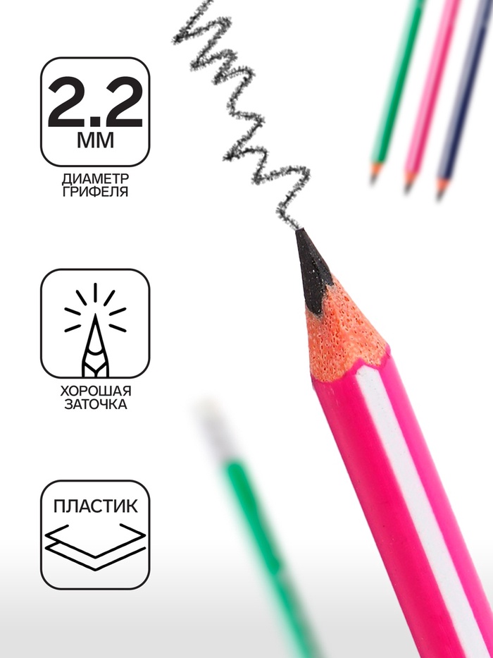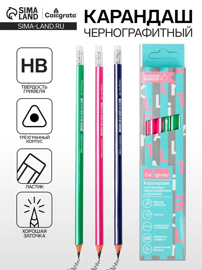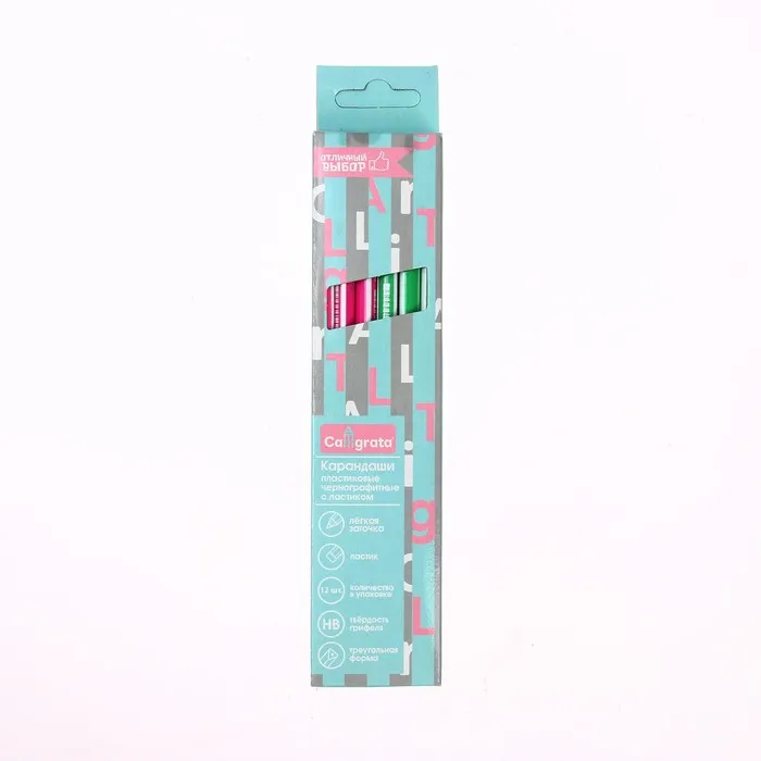 Твердость - HBМатериал корпуса - пластикФорма корпуса - трехграннаяНаличие ластика - естьЗаточено - даДлина - 189Цвет корпуса - ассортиРисунок на корпусе - нетДиаметр грифеля - 2,1Ударопрочный грифель - нетНаличие европодвеса - даНаличие штрихкода на ед. товара - естьДиаметр корпуса - 7Вид минимальной групповой упаковки - картонная коробкаПокупайте набор чернографитных карандашей Calligrata по выгодной цене в нашем интернет-магазине!