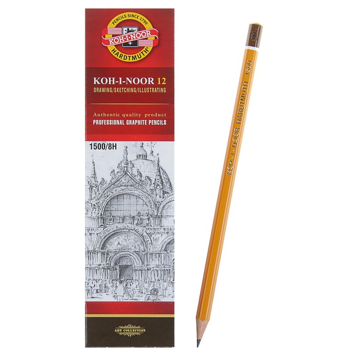 Профессиональный карандаш Koh-I-Noor серии 1500 - наиболее известная модель фабрики. Изготавливается компанией более 120 лет. Модель легко узнаваема благодаря неизменному жёлтому покрытию и позолоченной надписи. Грифель карандаша мягкий и прочный. Оставляет яркий и насыщенный след. Корпус изготовлен из прочной древесины. Это делает карандаш очень удобным при работе с чертежами, графикой и художественными рисунками.