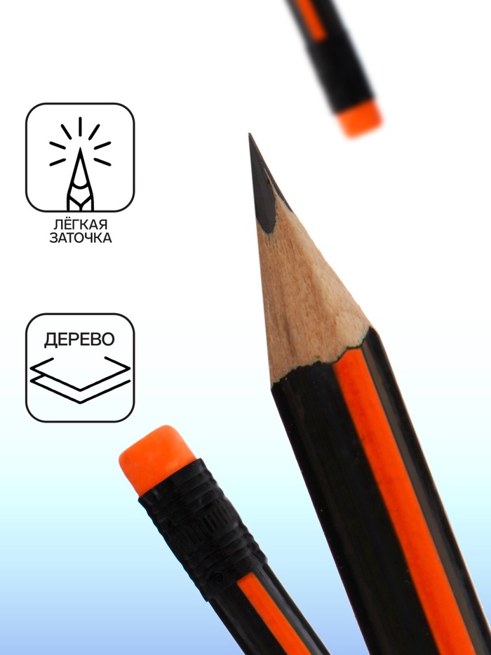 Карандаш чернографитный изготовлен из дерева высокого качества и оснащен ластиком.