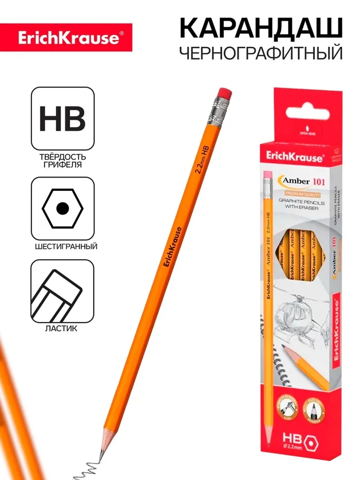 Классический шестигранный чернографитный карандаш с ластиком из отборной древесины, твердость НВ. Специальная пропитка древесины и сплошная проклейка грифеля обеспечивает высокую ударопрочность. Мягкая древесина и идеальная центровка грифеля гарантируют легкую заточку с экономным расходом карандаша. Грифель диаметром 2,2мм не царапает бумагу и не крошится. Ластик карандаша средней жесткости изготовлен из экологически чистого и гипоаллергенного материала термопластичной резины (TPR). Не содержит ПВХ.