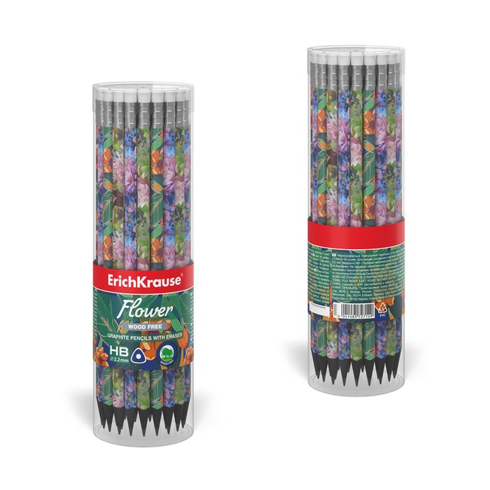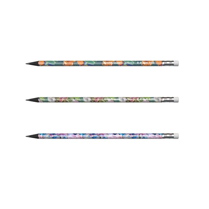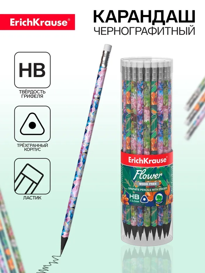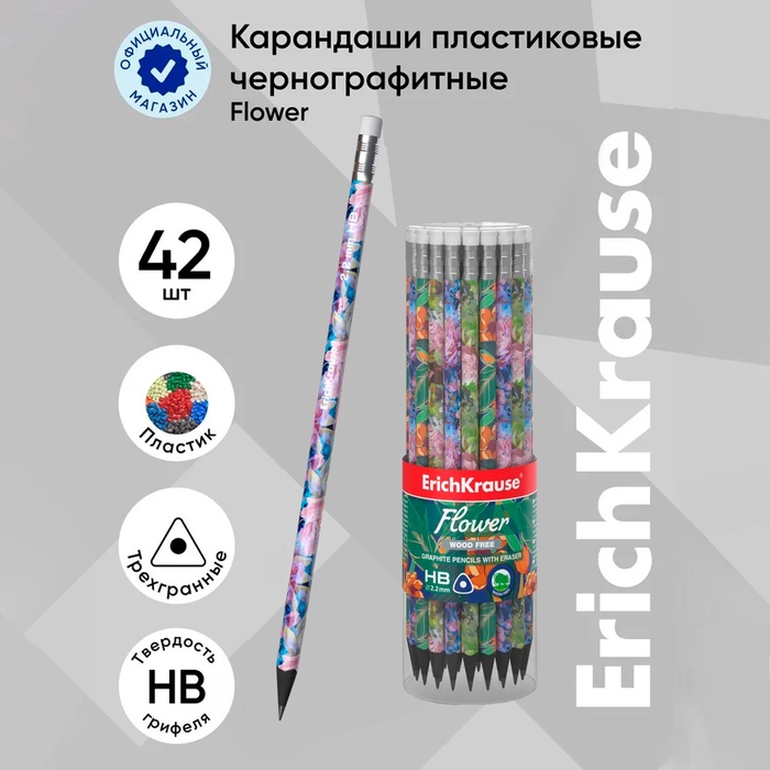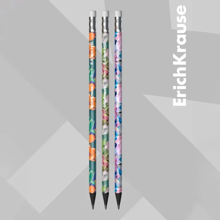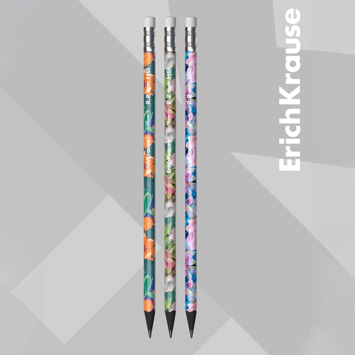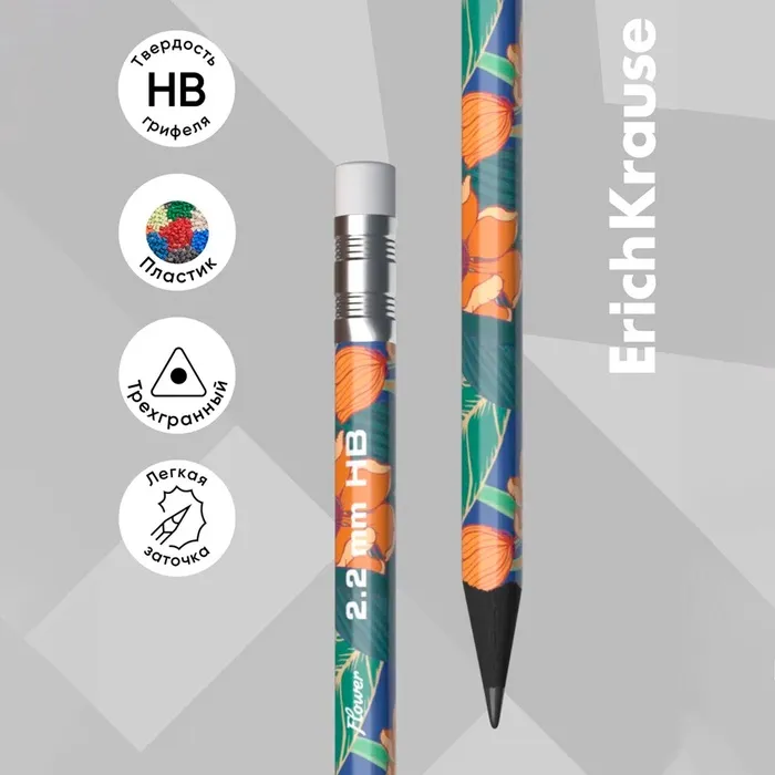 Карандаш чернографитный с ластиком ErichKrause "Flower", HB, грифель d=2.2 мм, пластик, трёхгранный в тубусе, микс — Характеристики