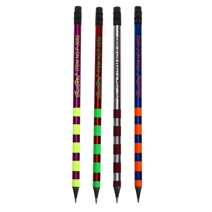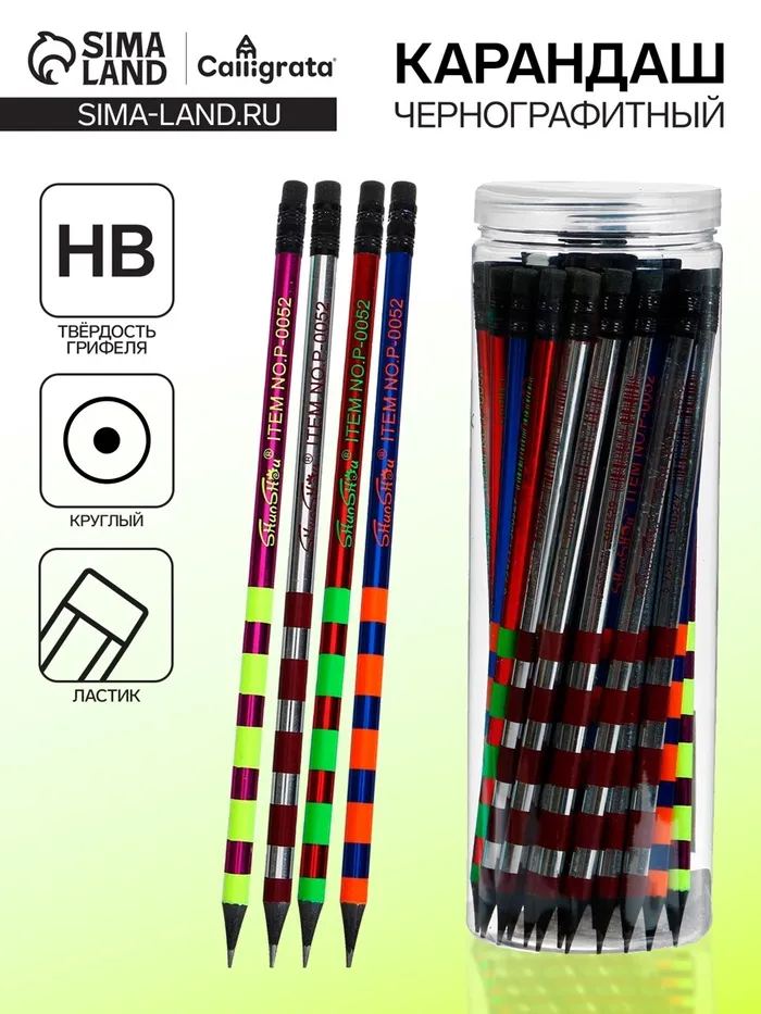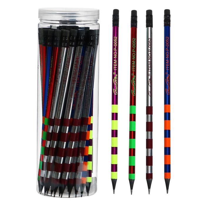 Карандаш чернографитный с ластиком «Полоски», твёрдость НВ, корпус металлик, в тубе, МИКС, штрихкод на штуке — Характеристики