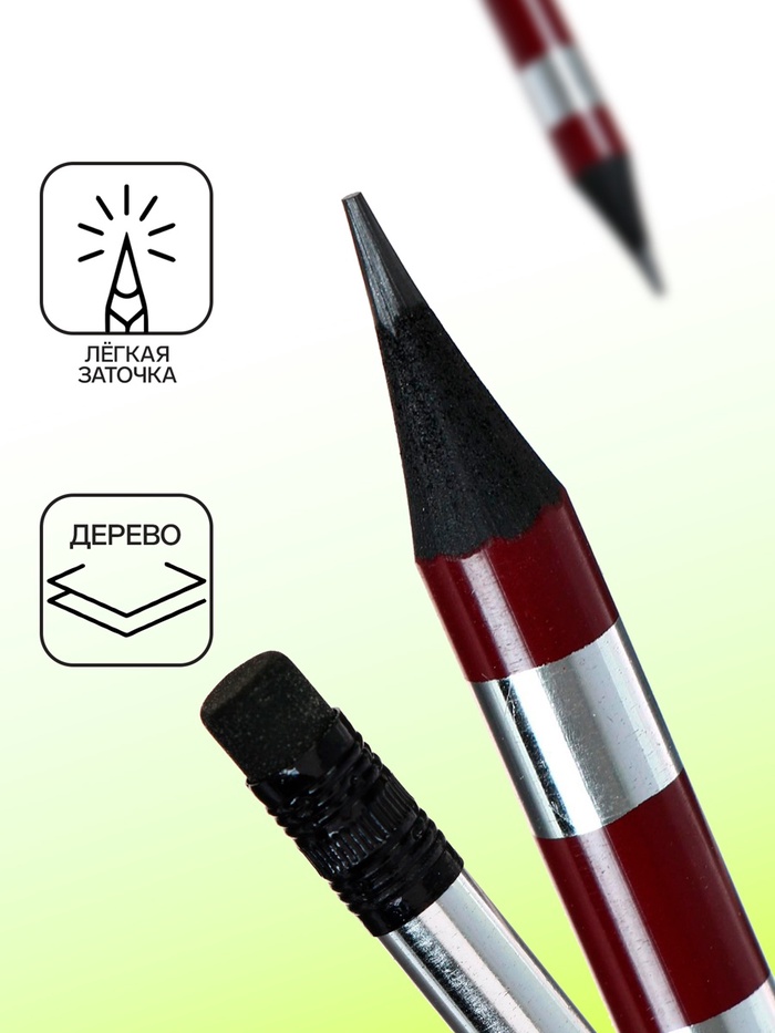 Карандаш чернографитный изготовлен из дерева высокого качества и оснащен ластиком.