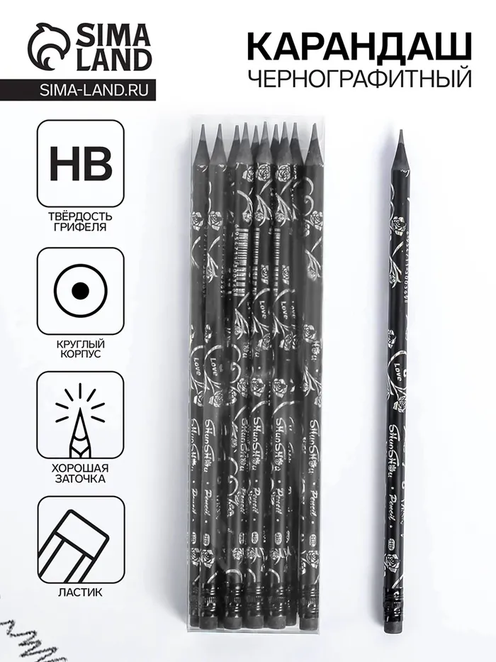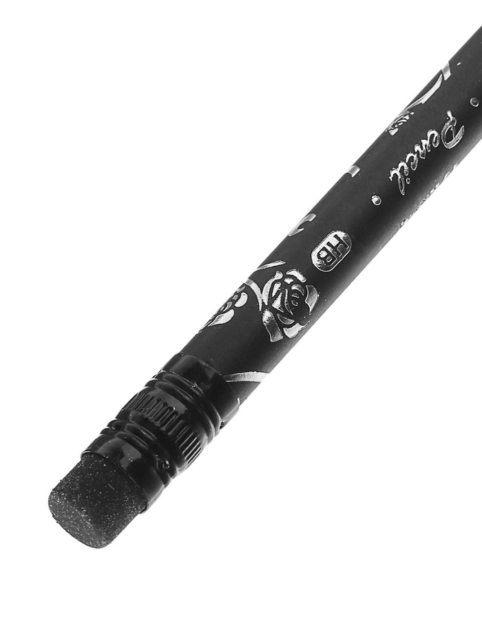 Карандаш чернографитный, с ластиком, твёрдость НВ, корпус чёрного цвета, круглый с рисунком, заточенный — Характеристики