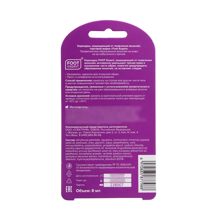Карандаш Foot Expert — это эффективное средство для защиты от мозолей, которое мгновенно уменьшает трение кожи о внутреннюю поверхность обуви. Он предотвращает появление мозолей и не оставляет следов.