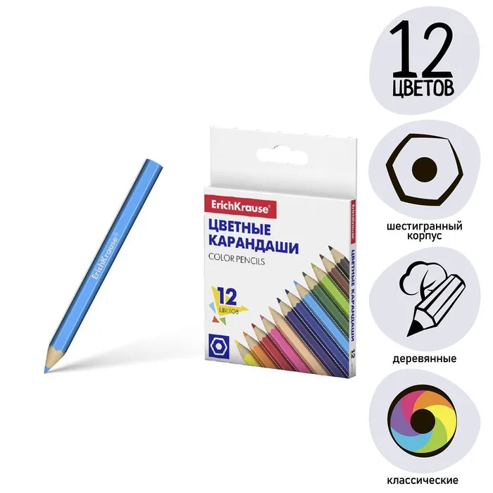 Карандаши 12 цветов ErichKrause Mini, дерево, шестигранные, 2.6 мм грифель, картонная упаковка, европодвес — Характеристики