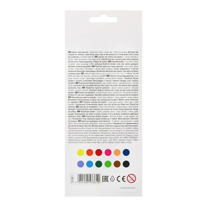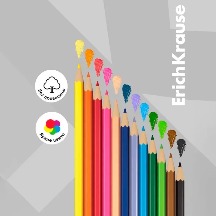 Идеальная центровка грифеля и пластичность материала карандаша гарантирует легкую заточку с экономным расходом карандаша. Грифель диаметром 2.6 мм не ломается и не крошится даже при сильном нажиме. Цвета в наборе: жёлтый, оранжевый, красный, розовый, лососевый, лиловый, синий, голубой, салатовый, зелёный, коричневый, чёрный.