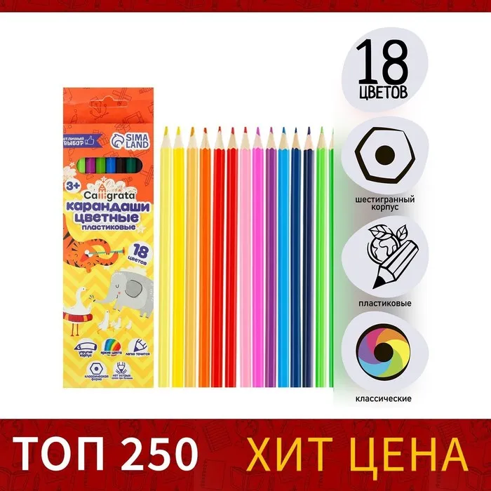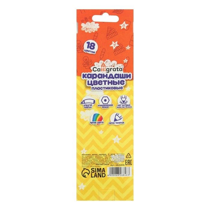 Карандаши 18 цветов Calligrata, ЭКОНОМ, заточенные, шестигранные, пластиковые, картонная упаковка, европодвес — Характеристики