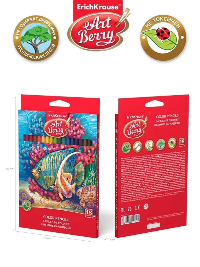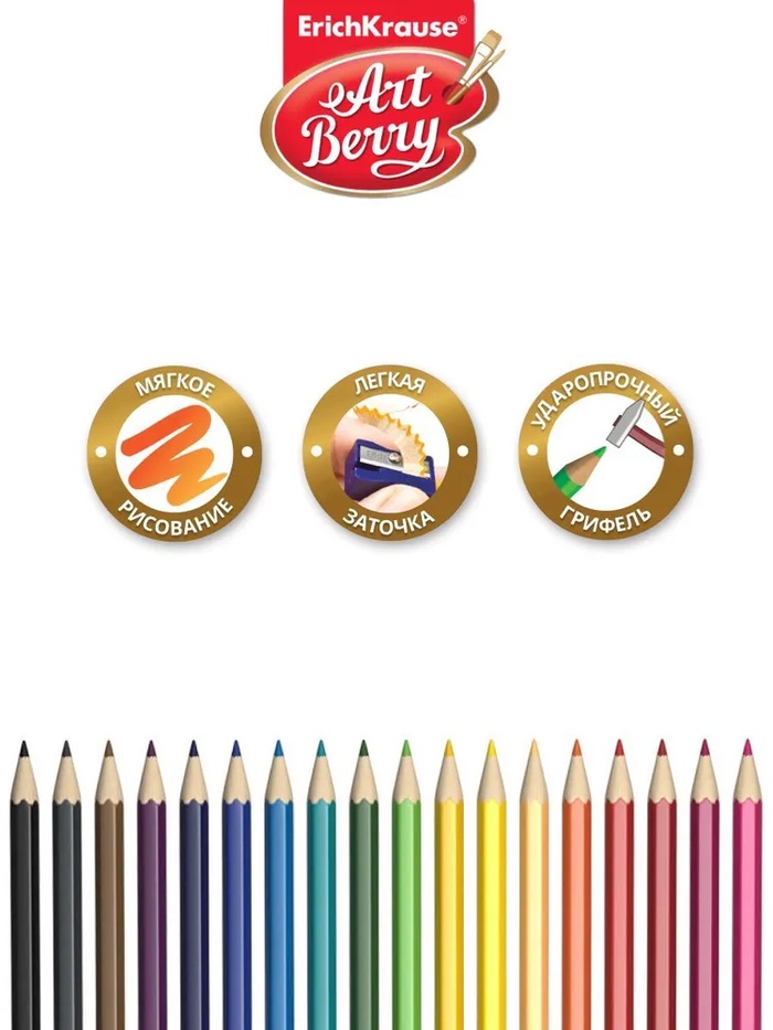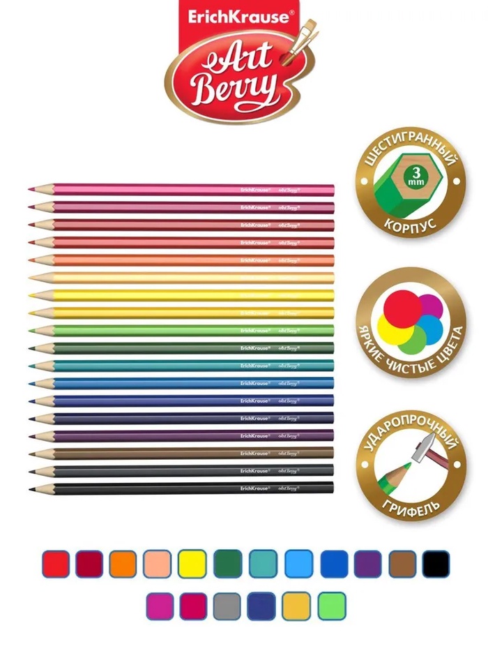 Карандаши 18 цветов ErichKrause ArtBerry премиум, дерево, шестигранные, яркий и мягкий грифель 3.0 мм, картонная упаковка, европодвес — Характеристики