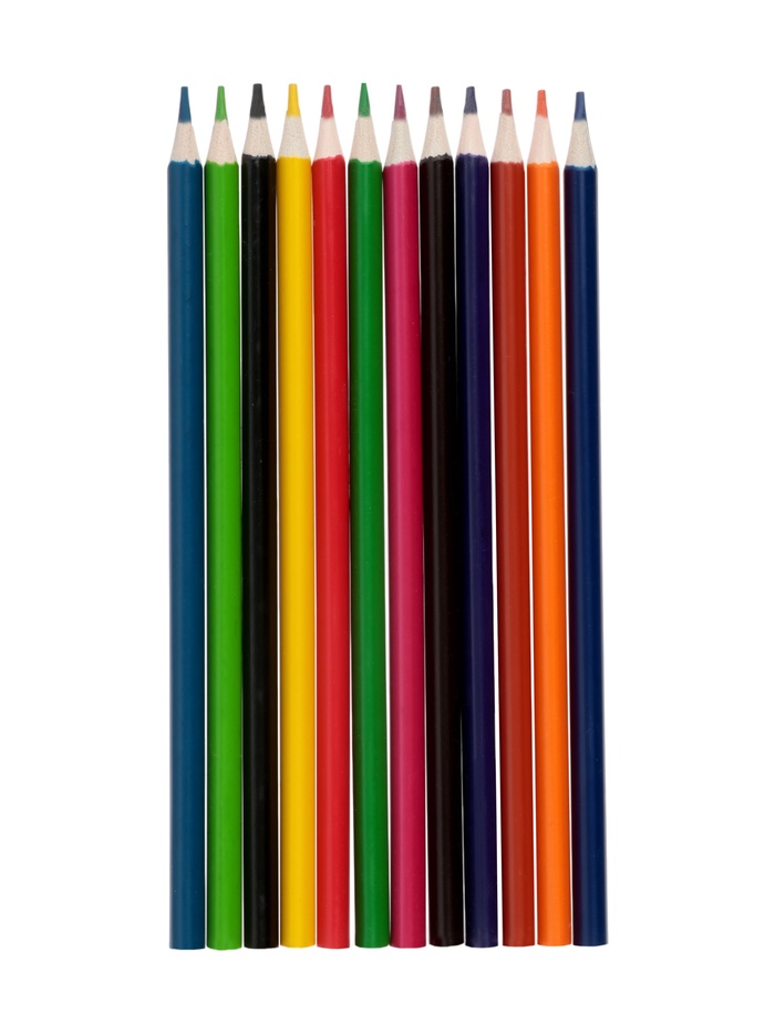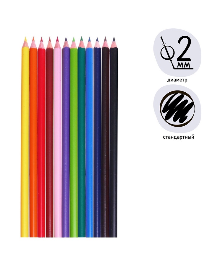 Набор цветных карандашей бюджетной ценовой категории, 12 цветов, яркие цвета, стандартный средней жесткости грифель.