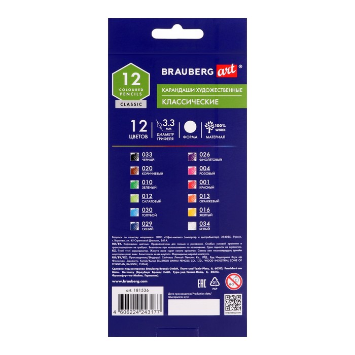 Карандаши художественные цветные BRAUBERG ART CLASSIC, 12 цветов, мягкий грифель 3.3 мм — Характеристики