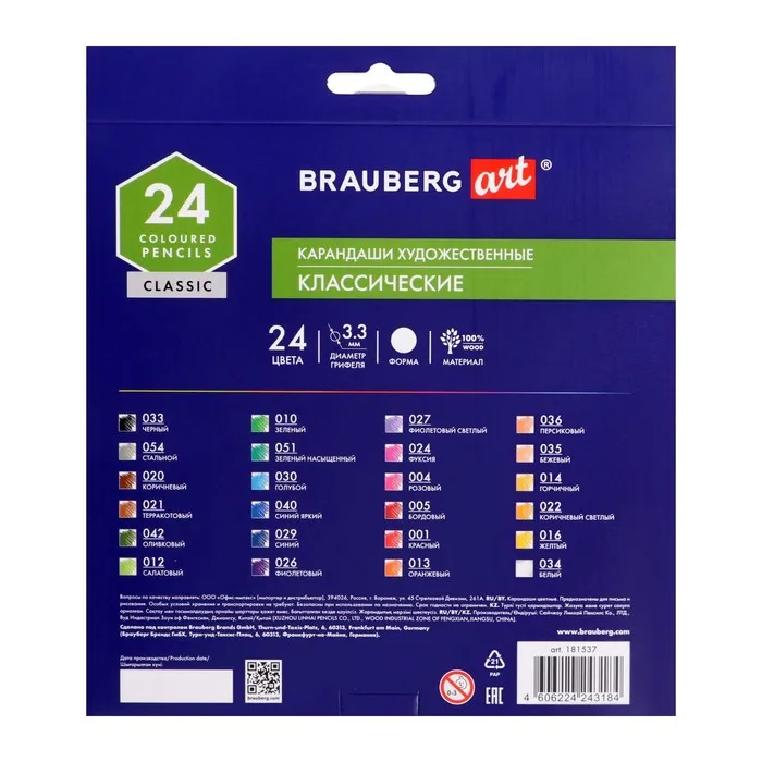 Карандаши художественные цветные BRAUBERG ART CLASSIC, 24 цвета, мягкий грифель 3.3 мм, — Характеристики