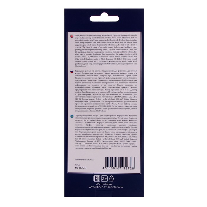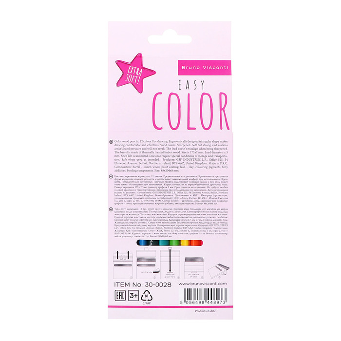Карандаши цветные 12 цветов BrunoVisconti Easycolor, трёхгранные, особо мягкие — Характеристики