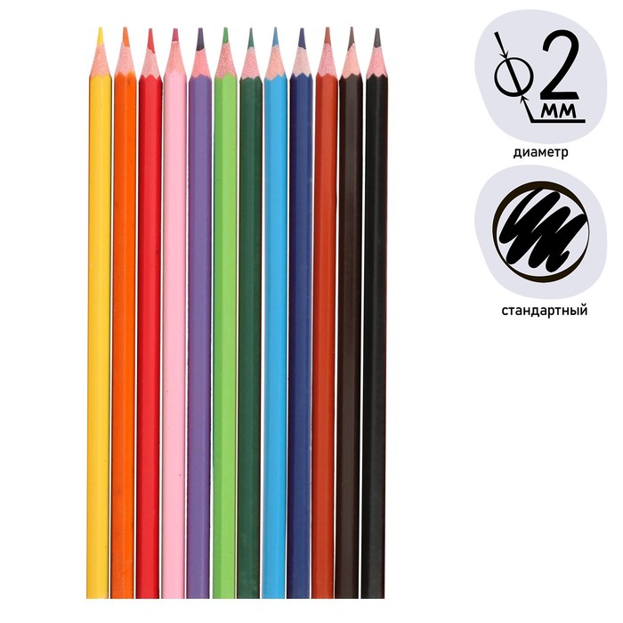 - Набор состоит из 12 цветов: розовый, красный, желтый, оранжевый, салатовый, зеленый, голубой, синий, фиолетовый, коричневый, темно-коричневый, черный. Шестигранная форма сечения корпуса позволяет не скатываться карандашу с поверхности стола во время занятий рисованием.