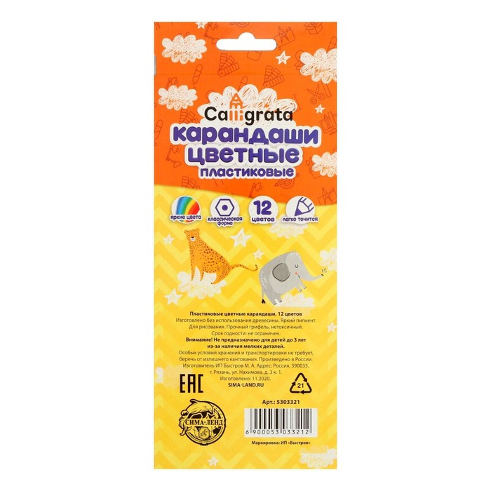 Карандаши цветные 12 цветов Calligrata, ЭКОНОМ, заточенные, шестигранные, пластиковые, картонная упаковка, европодвес — Характеристики