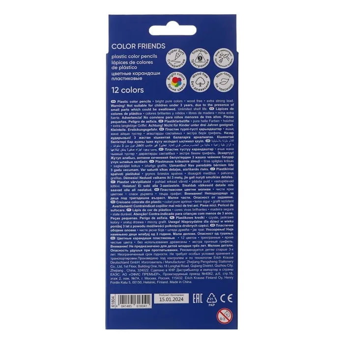 Карандаши цветные 12 цветов ErichKrause Color Friends, трёхгранные, пластиковые, с европодвесом — Характеристики