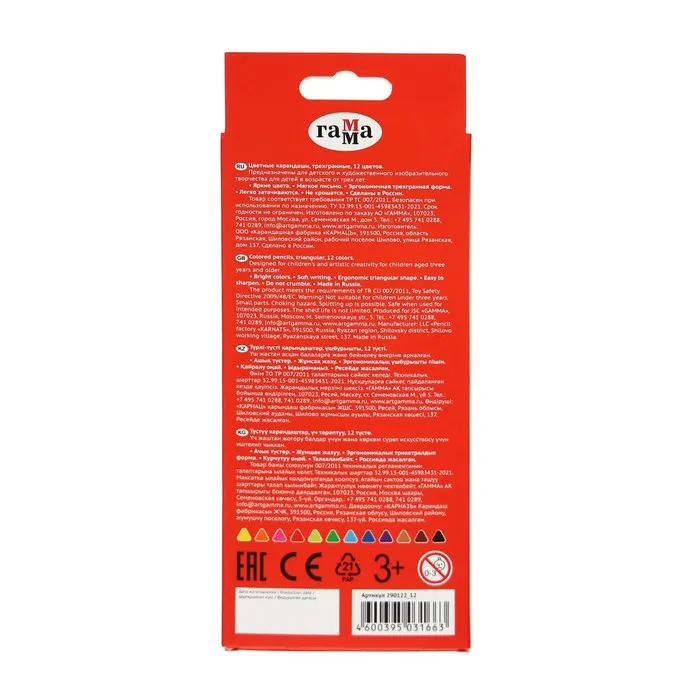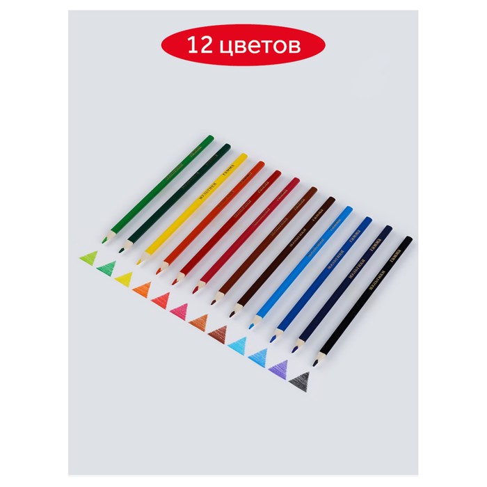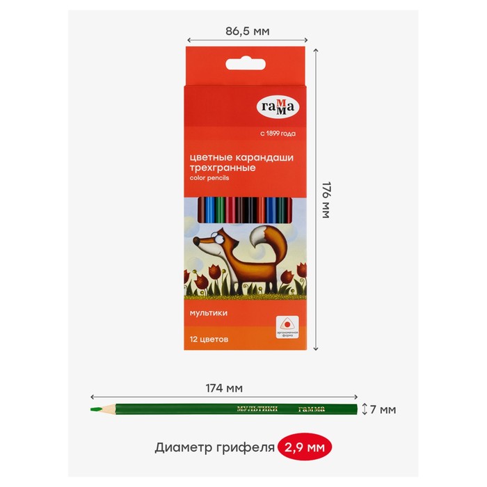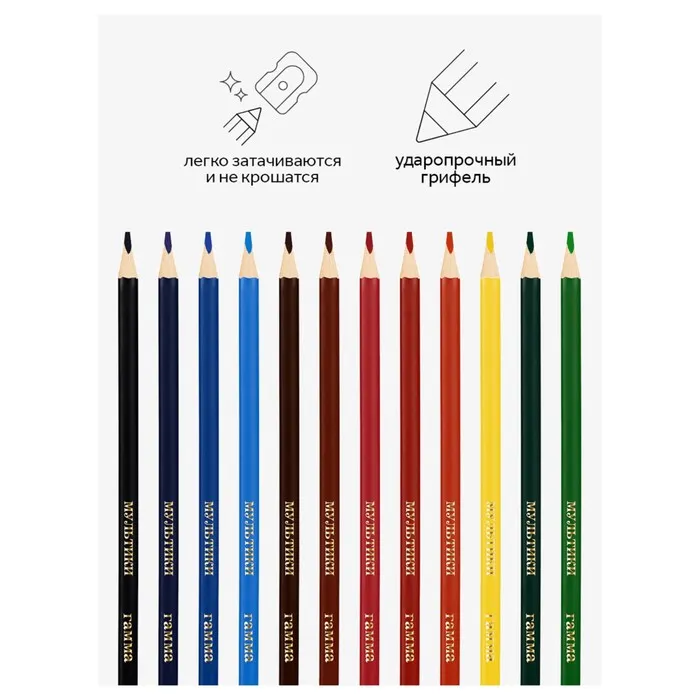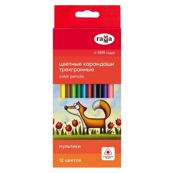 Карандаши цветные 12 цветов «Гамма. Мультики», трёхгранные, заточенные, картонная упаковка, (290122_12) — Характеристики