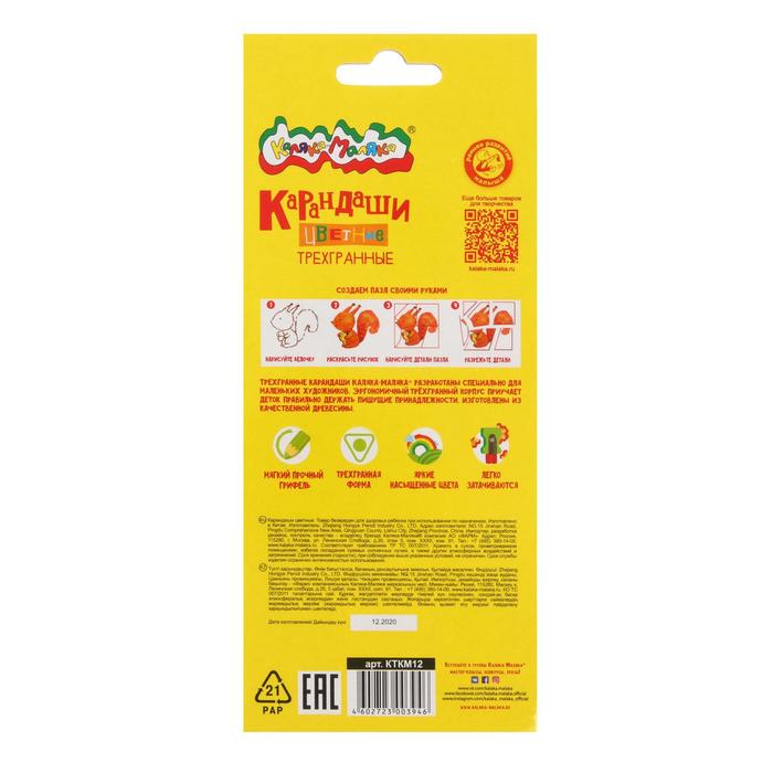 Карандаши цветные 12 цветов «Каляка-Маляка», трёхгранные — Характеристики