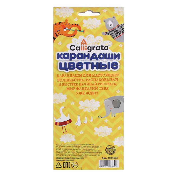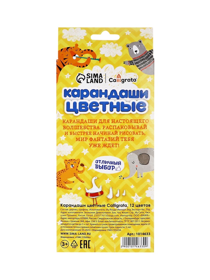 Не токсичны и абсолютно безопасны.Набор состоит из 12 цветов.Яркие цвета развивают цветовосприятие ребенка.Они изготовлены из древесины ценных пород и имеют лакированный корпус.Высокосортная древесина и качество исполнения гарантируют легкую заточку.Мягкий грифель обладает повышенной прочностью, не ломается и не крошится при заточке.Все карандаши заточены и поставляются в картонной упаковке с европодвесом.Цветные карандаши позволят юным художникам выразить свои мысли и эмоции в красивых рисунках.