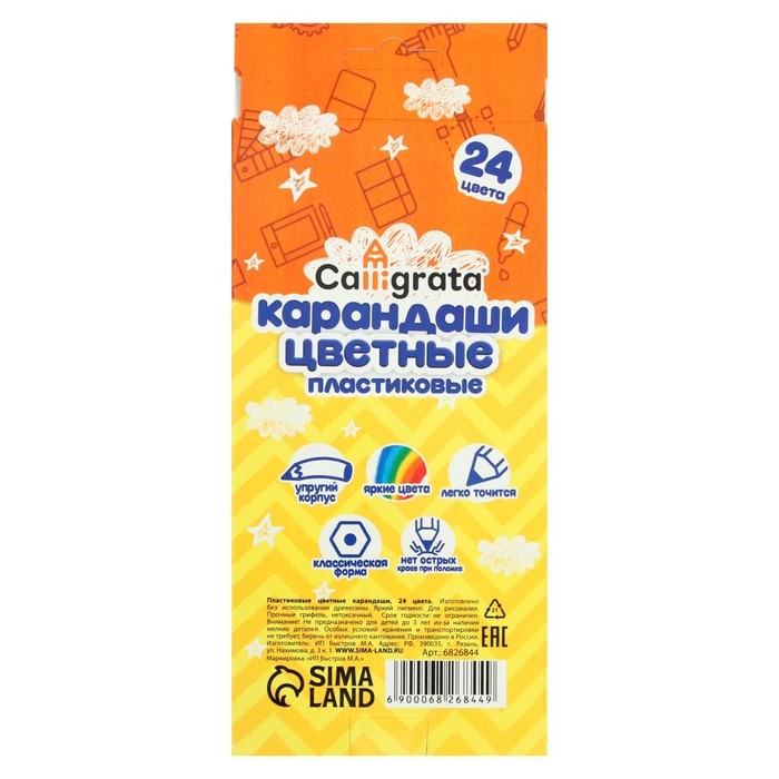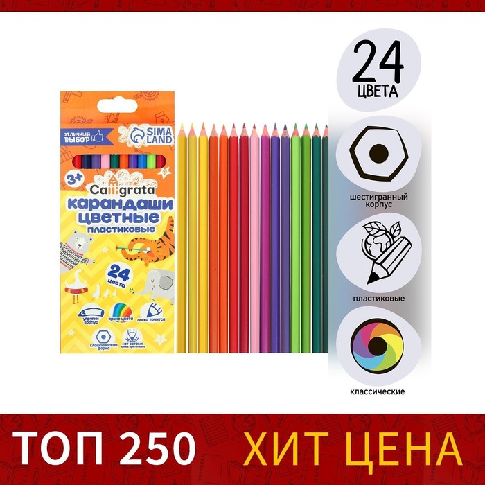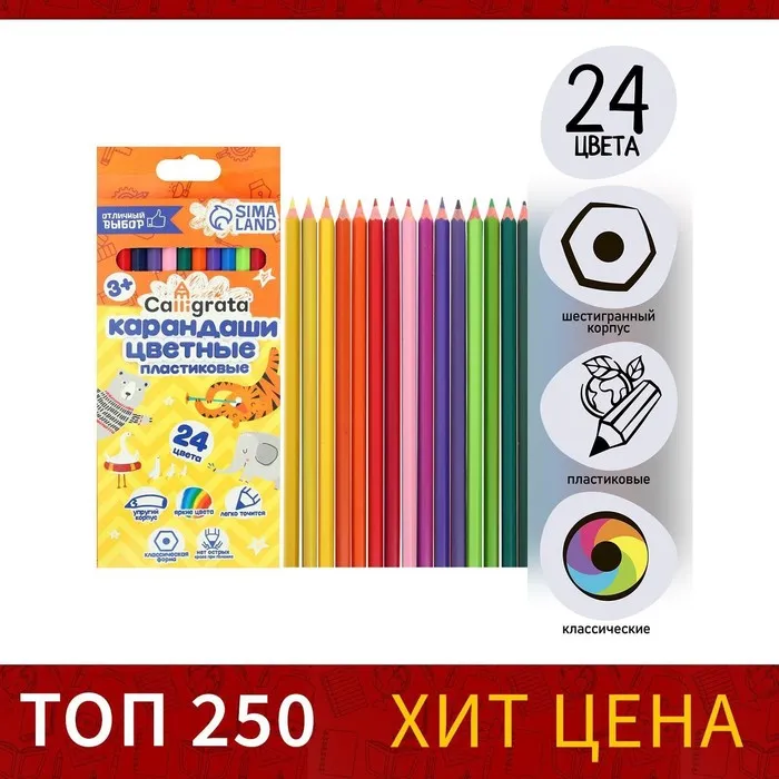Карандаши цветные 24 цвета Calligrata ЭКОНОМ, заточенные, шестигранные, пластиковые, картонная упаковка, европодвес — Характеристики